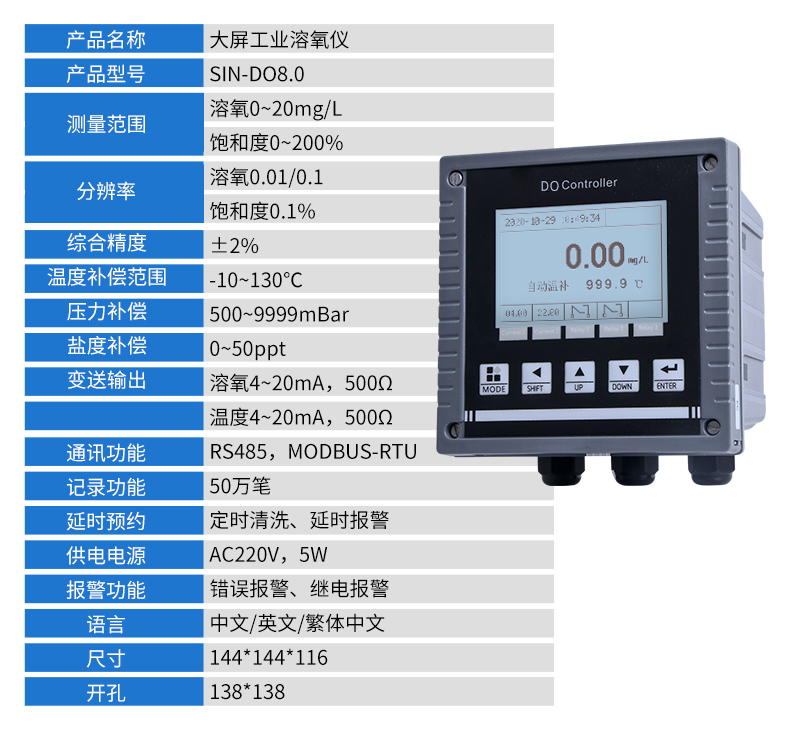 聯(lián)測儀表SIN-DO8.0膜法溶氧儀儀器用于工業(yè)上溶氧%/ppm/mgL/ugL/ppb 及溫度的測量,如:發(fā)酵,飲用水,鍋爐水,海水,養(yǎng)殖,水族館,地表水,工業(yè)污水,都市廢水,環(huán)境監(jiān)測,食品生產(chǎn)過程等,儀器可以盤面安裝,壁掛安裝,管路安裝,儀器提供 2 路電流輸出,最大負(fù)載為 500Ω,儀器提供 3 路控制用繼電器,繼電器最大承受電壓及電流為 5A/250VAC 或 5A/30VDC。