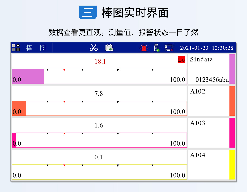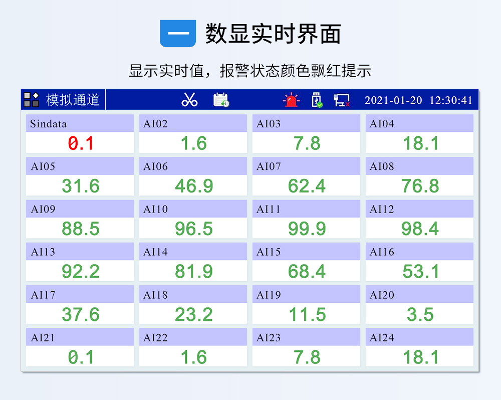 觸摸式彩色無紙記錄儀具有 60 個運算函數、24 路模擬量輸入、3 路 開關量輸入、3 路脈沖量輸入、6 路模擬量變送輸出、16 路開關量輸出, 可實現運算、顯示、記錄、報警、分析統計報表、高速采樣等功能,通 過 RS-232/RS-485 和以太網通訊接口,可實現遠程實時監控、組態管理、 歷史數據讀取等功能,通過 U 盤可實現組態管理、監控畫面管理和歷史 數據管理等功能。