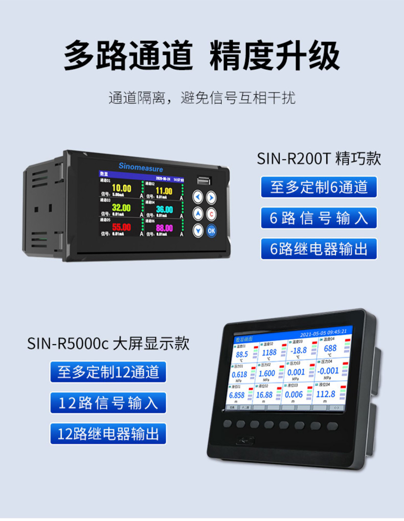 聯測儀表SIN-R200T工業無紙記錄儀,6通道萬能輸入,160*80 面板尺寸??奢斎腚娏?、電壓、熱電偶、熱電阻和頻率等工業信號,以數值、棒和曲線形式實時顯示數據,定時將數據存儲于儀表內部電子存儲器,可通過 USB 設備快速轉存歷史數據。