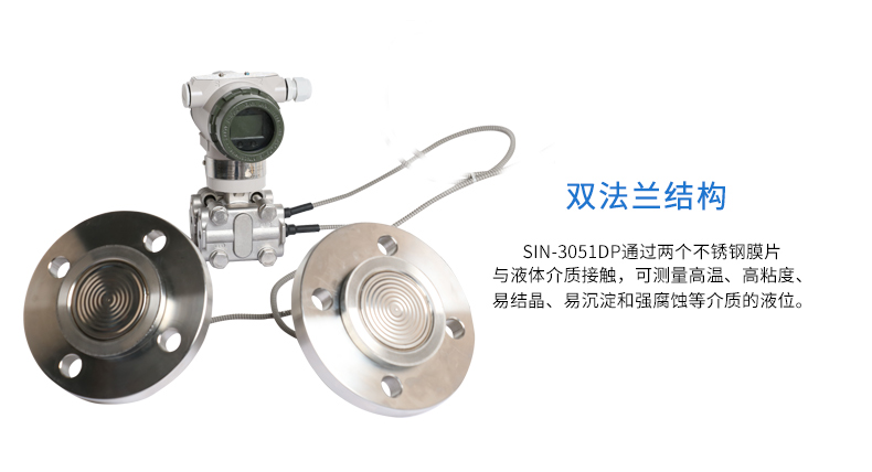 SIN-3051DP雙法蘭差壓液位變送器是一種為避免被測介質直接作用于變送器的遠傳隔離膜片接觸而采用的差壓式變送器(結構測量法)。